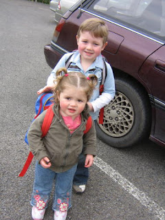 As I was leaving this morning, Lachie had just written Lily's name on her painting (picture taken through the window) A new friend drew this picture with her this afternoon... Lachie's had a great day too, apparently he's been incredibly helpful! He got both lunch boxes at morning tea time, and Lily got both lunch boxes at lunch time! Here's his flower picture... Lily know's all the kids anyway, so she fitted in really well. Here's Lachie's friend Sophie checking to see if Lily's ok... And a quick see-saw before leaving. (NOT even weight distribution!)